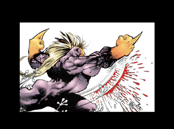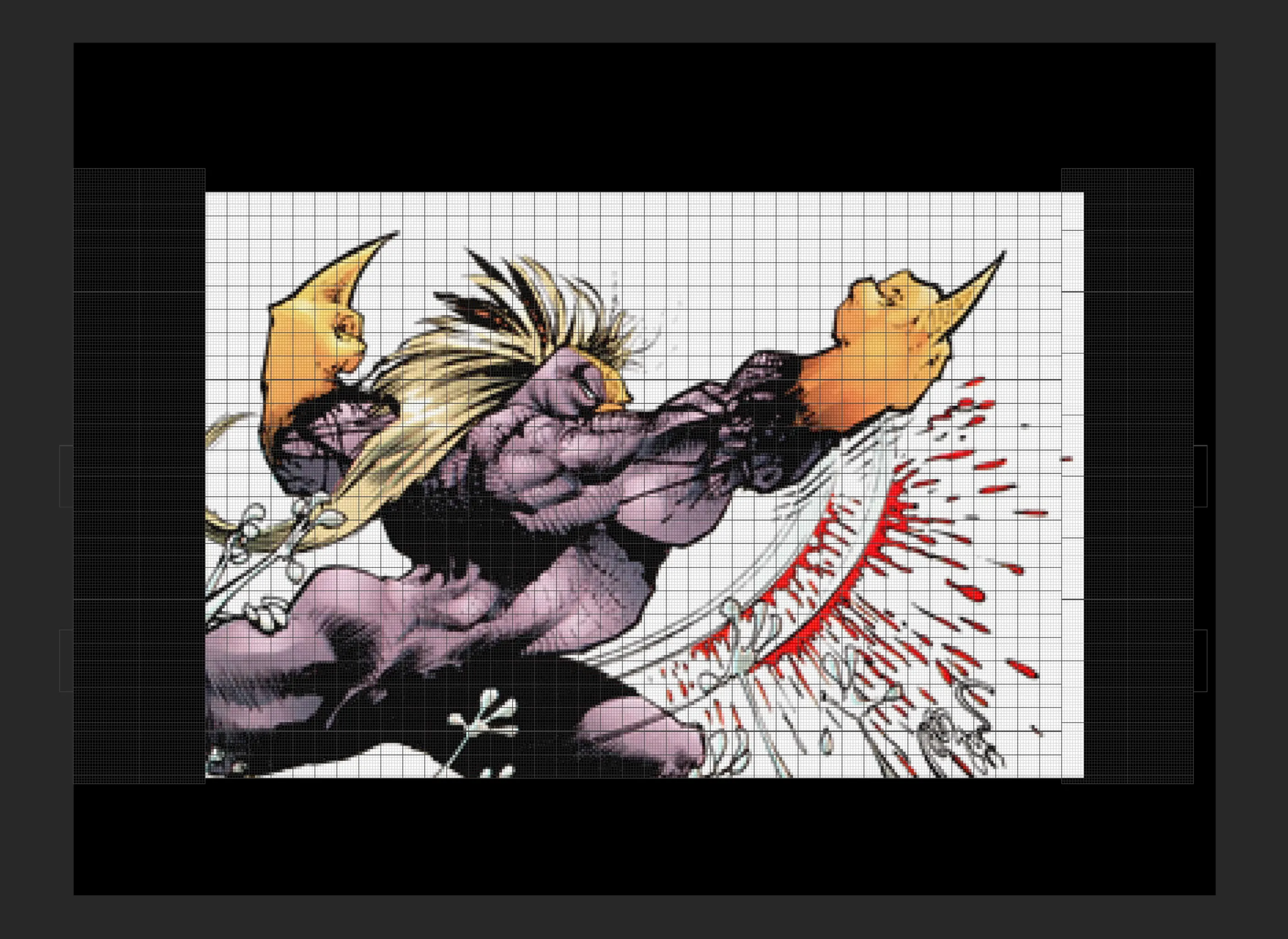 When comparing it to the original, a lot of fine details are lost (well, that's no surprise, right?), but I think I've managed to add a dash of brutal violence back into it, especially with the thick outline around Maxx that seperates not only the colors but himself from the panel, like he's not only slashing through those Isz, but almost also ripping his reality apart, which, if you know the series, is kind of fitting.