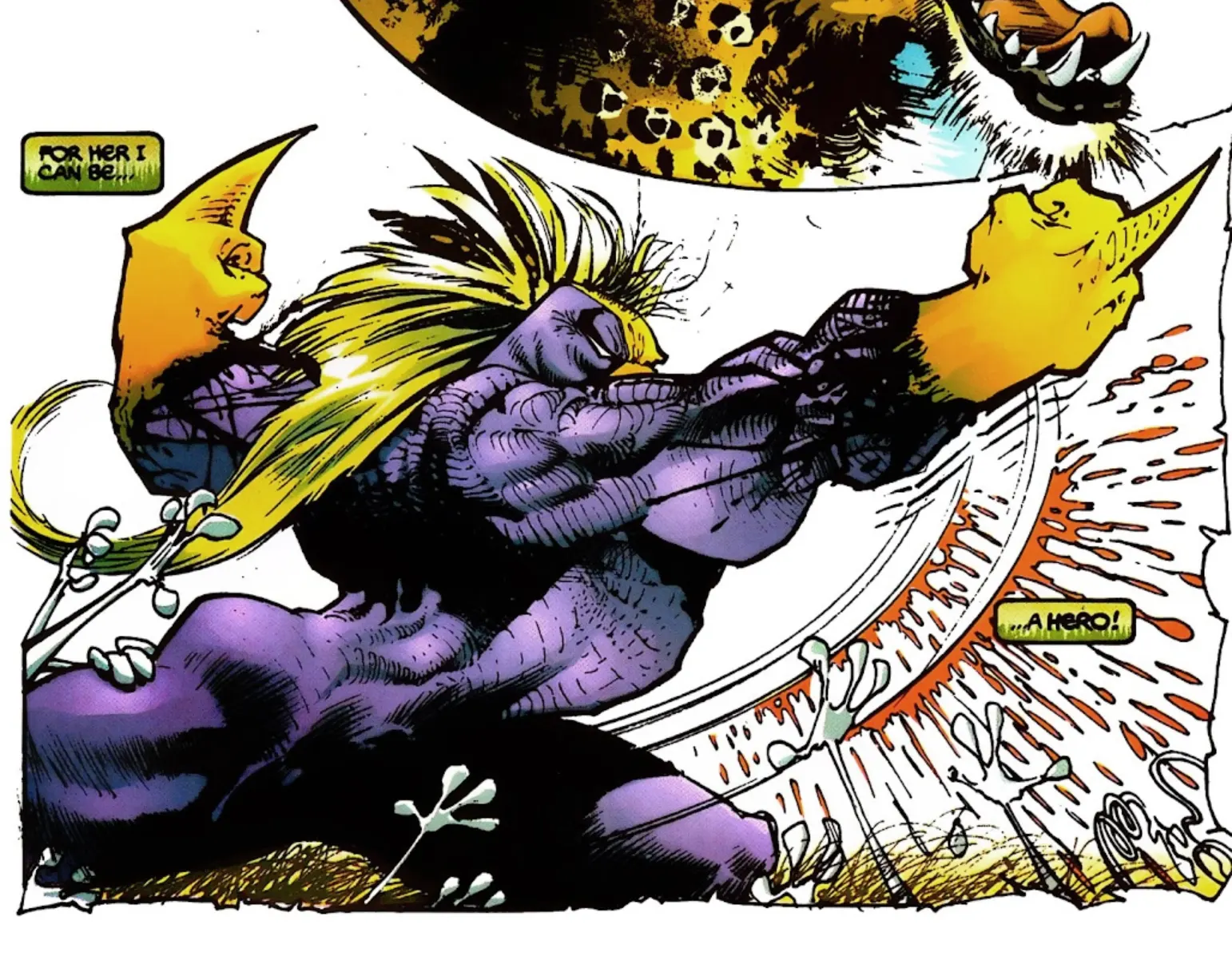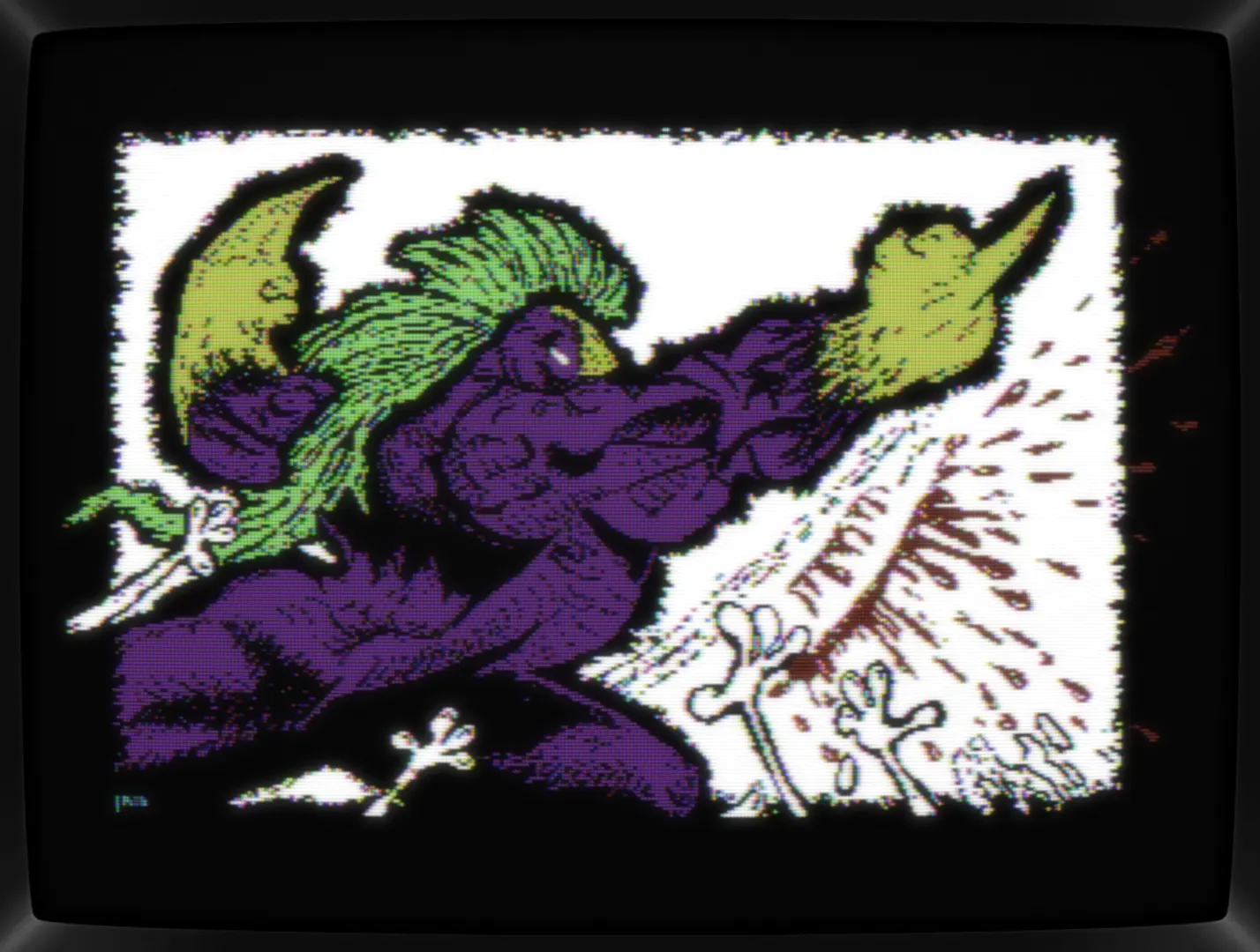I've just completed my Dinosaur Jmin PETSCII and really fell in love with the C64's purple and with that, my mind went to The Maxx, beloved 90's underground purple meatbag with a lampshade on his head and I just knew which panel to pick: him slashing through Isz.