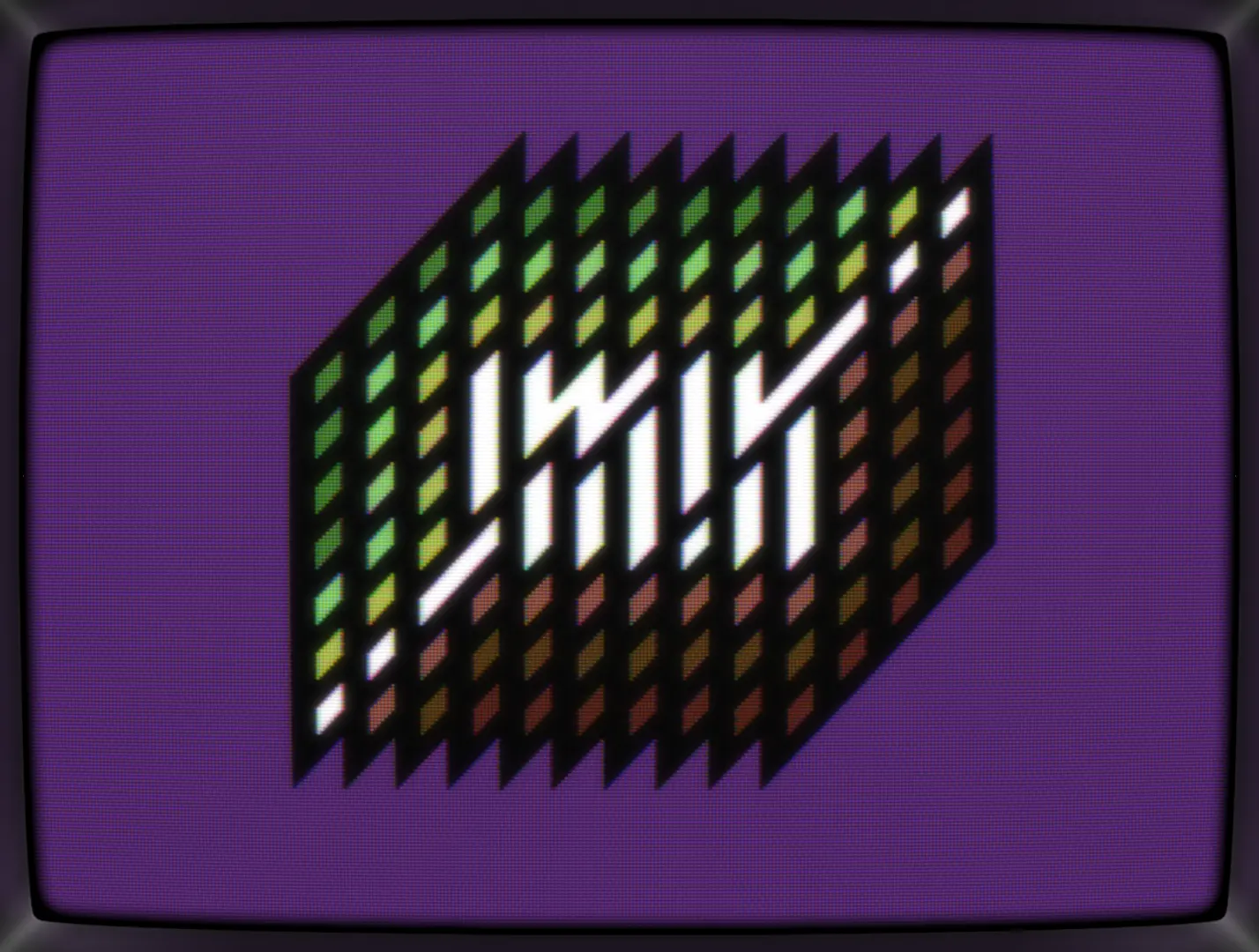 Bored by the patterns on my screen, I reduced them down to a single, slanted diamond. Then added some full chars for creating stripes. Cut stripes, huh? Let's add some color. And text. Yep, let's cut that text up. Hmmm...