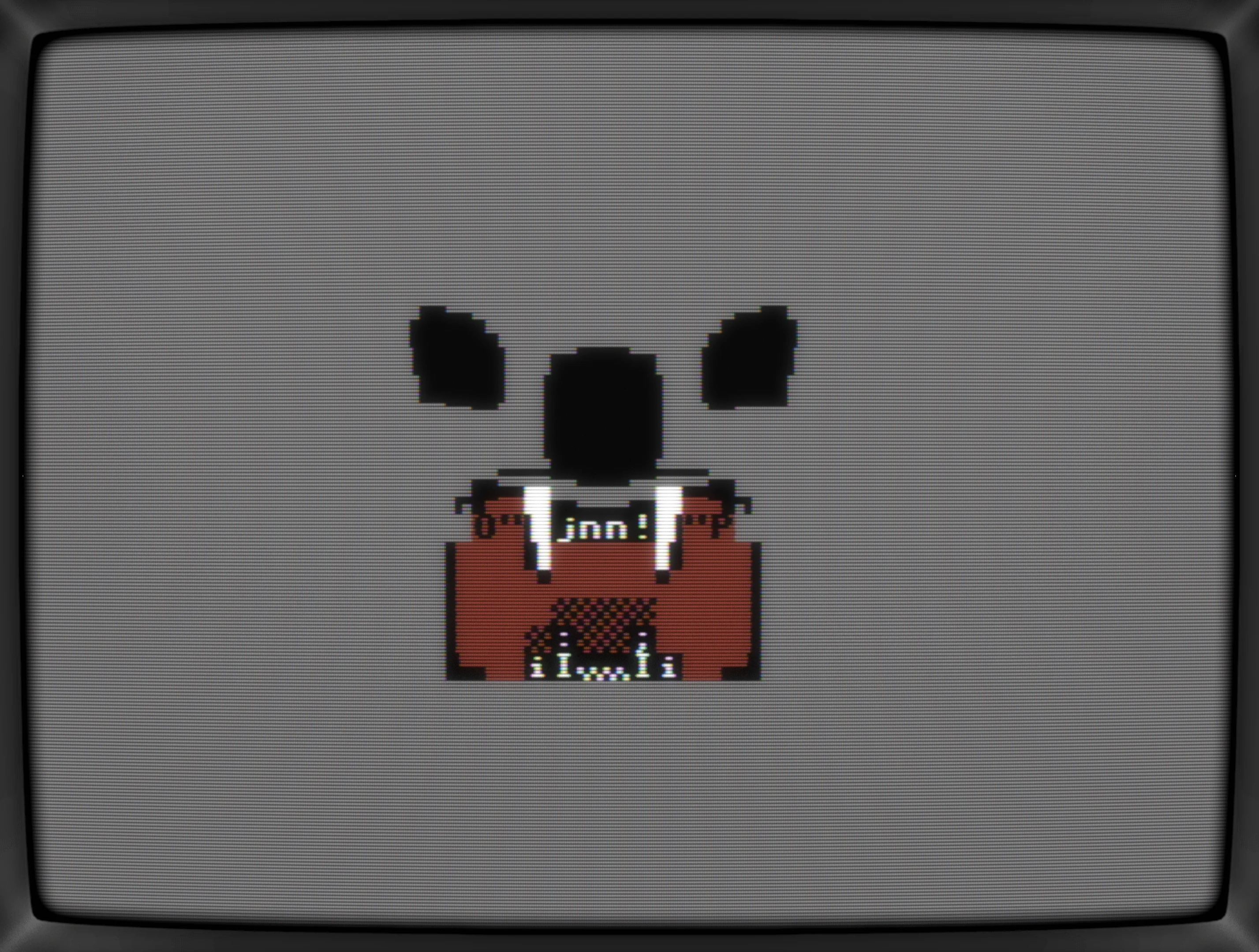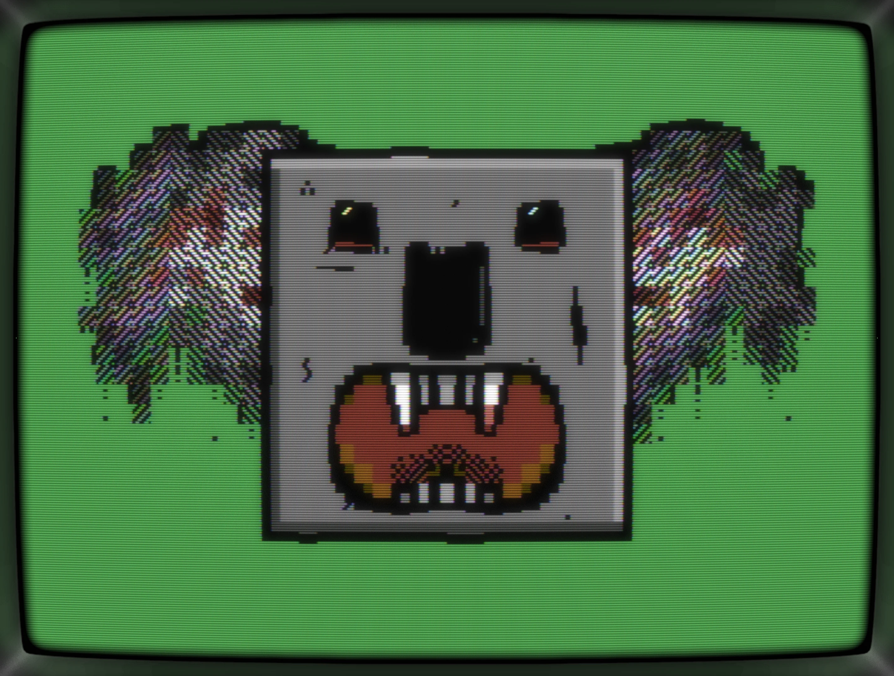 During a lunch break at work, I've started up PETSCII Editor, set border and background to grey and pixeled a rough layout of eyes, nose and a gnarly mouth with big fangs. That's the idea, just the monster coming right out of the monitor.