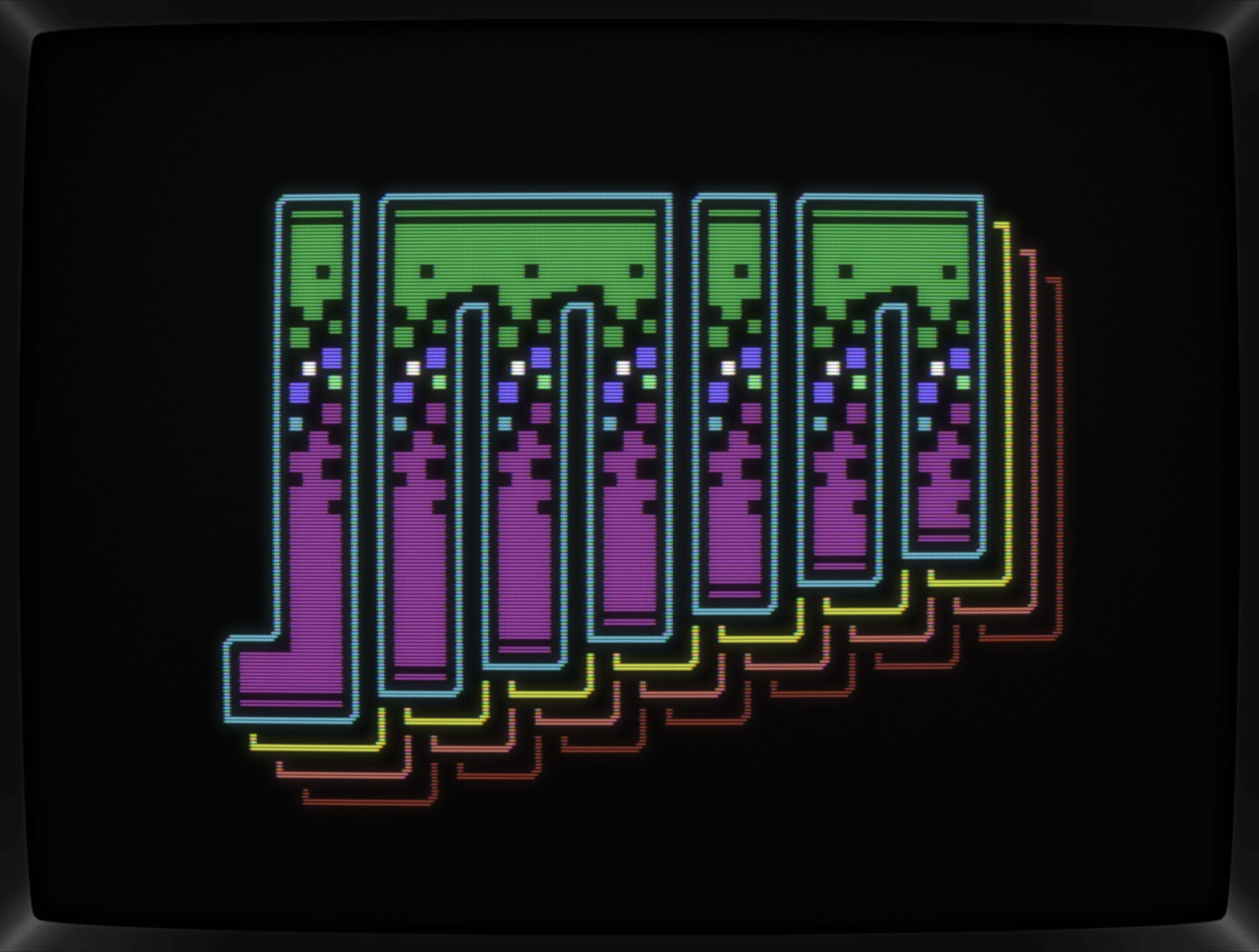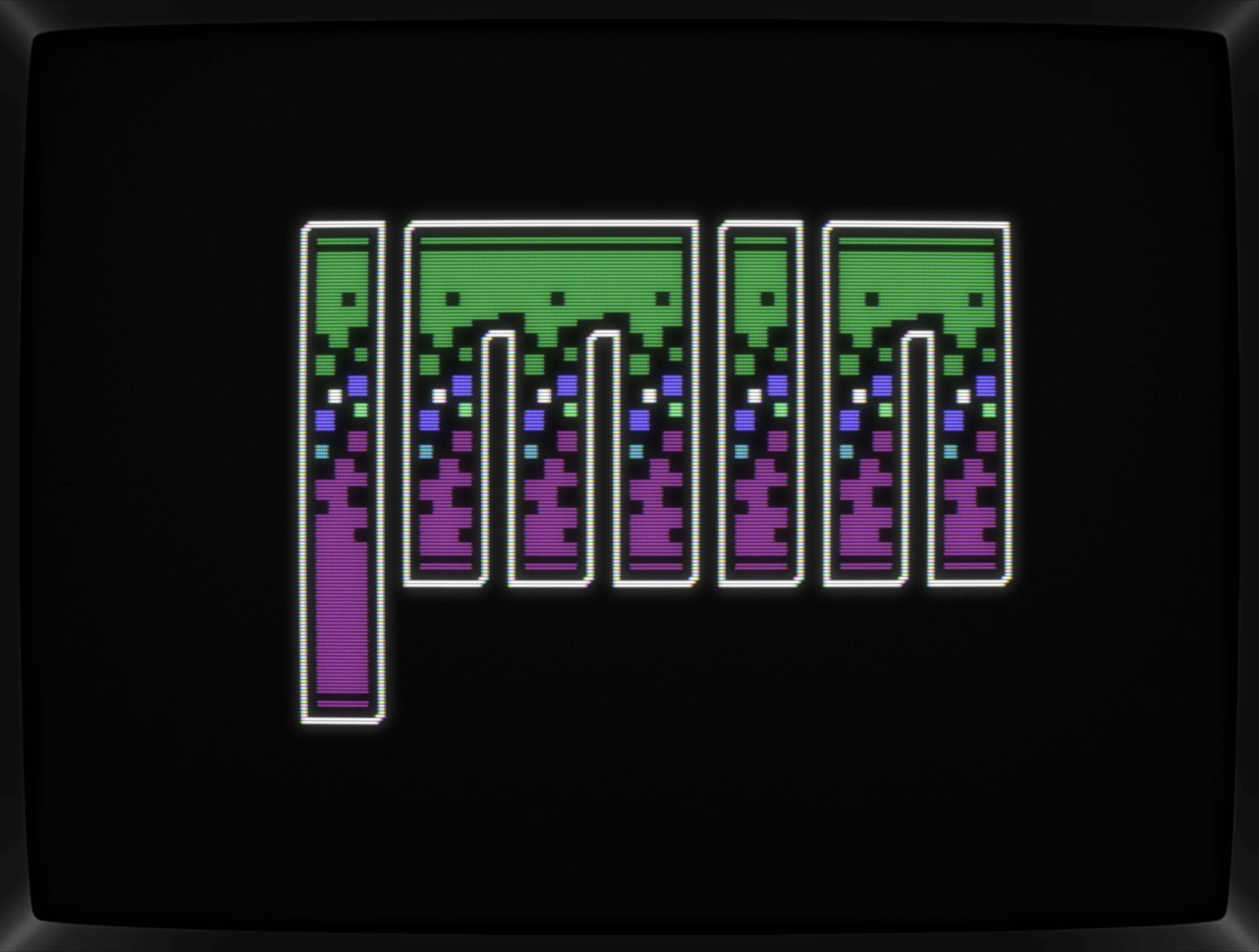 Anyway, while wading through my undone project files, I've rediscovered it and fell in love with it as soon as lit up in micro64. When chosing my handle jmin I've had it in my mind as bunch of parallel lines with varying lenghts and well, that's exactly what Neon Ooze is.